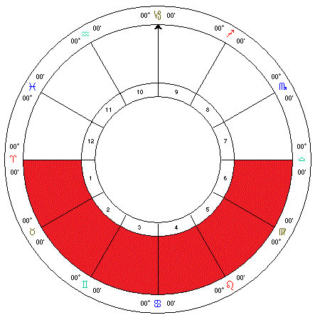 **Eastern Houses: **Includes the 1st, 2nd, 3rd, 10th, 11th and 12th houses.Shows the individual is independant if there is an overbalance of planets here.