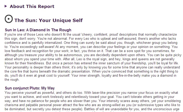 Just like you and your birth chart, astrological reports by The Astrologer are unique. They're high-quality, written with the expertise of our multi-accredited astrologers and the rest of our team. Generated online in seconds, our reports provide you with instant insight at your fingertips. Whether you have a pressing question about your future or you just want some fun, now you can have it all -- in a fast, focused, all-about-you format that can be printed out or saved to your hard drive.