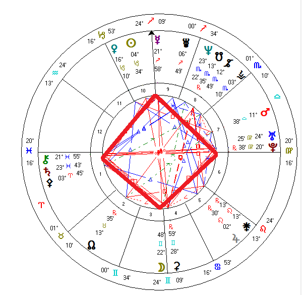 Whew, what a mouthful! And so is the influence of a Grand Cross in an astrological chart. Squares and oppositions are considered 'hard' aspects -- producing conflict and tension -- so you can imagine what all these squares and oppositions among four or more planets might produce. Stress of major proportions!